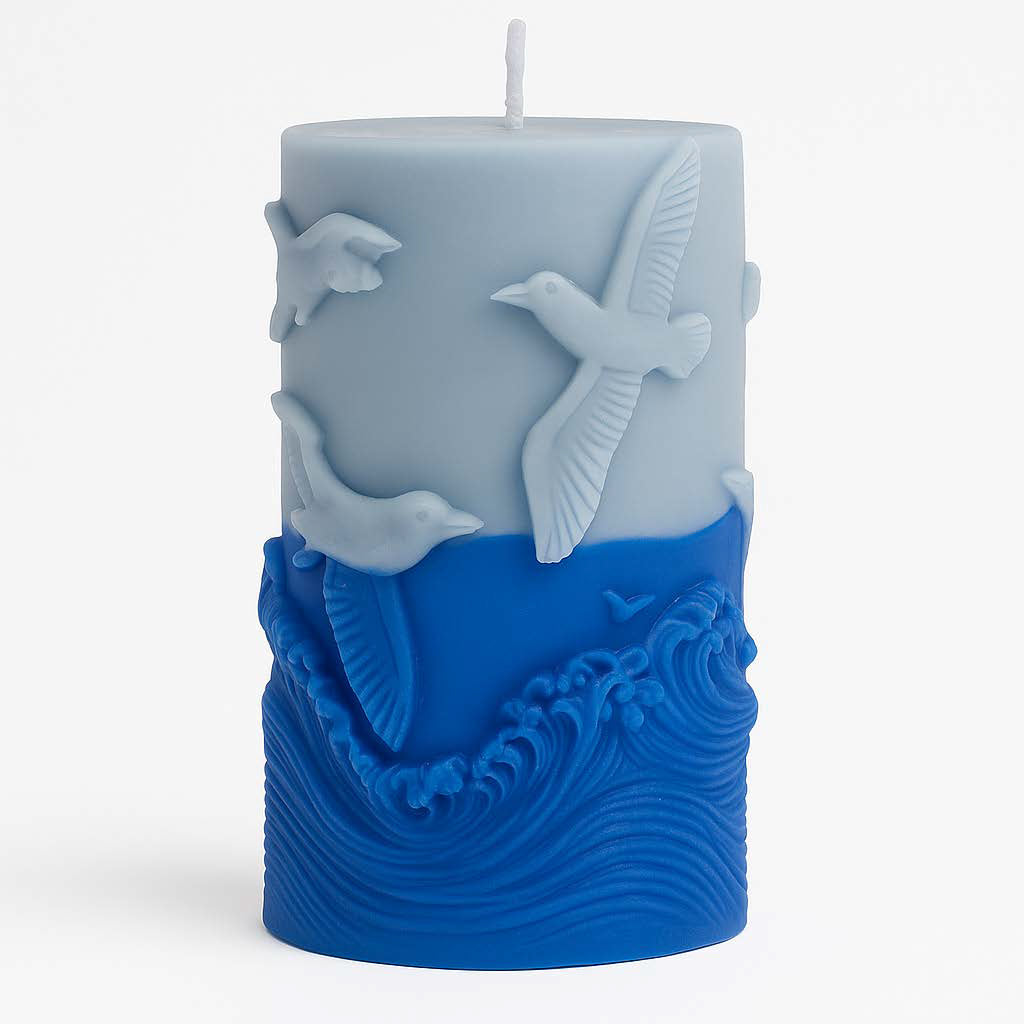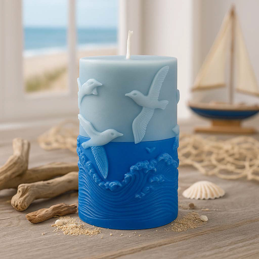 Diese maritime Kerze bringt den Zauber des Meeres direkt zu Ihnen nach Hause. Das detailreiche Relief zeigt Möwen, die über plastisch gestaltete Wellen fliegen – ein besonderes Design, das Urlaubsgefühle weckt und für eine außergewöhnliche Tisch- oder Raumdekoration sorgt.